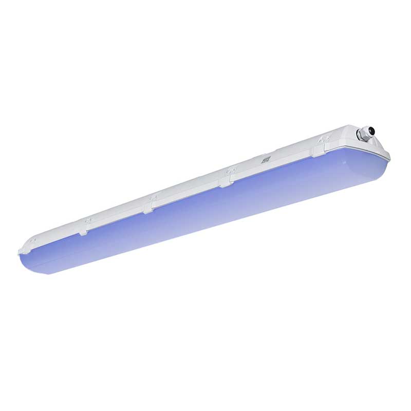 La réglette inactinique INACTINI BLUE est dédiée à l’éclairage des espaces d’élevage de volaille et les salles blanches. Elle possède un IP66 et un IK10. Disponible en option avec gradation DALI. Un IRC>80 en option est disponible pour les applications demandant un rendu de couleur élevé. Câblage interne avec connecteurs rapides et/ou traversants en option. Le corps en ABS a une résistance chimique accrue.